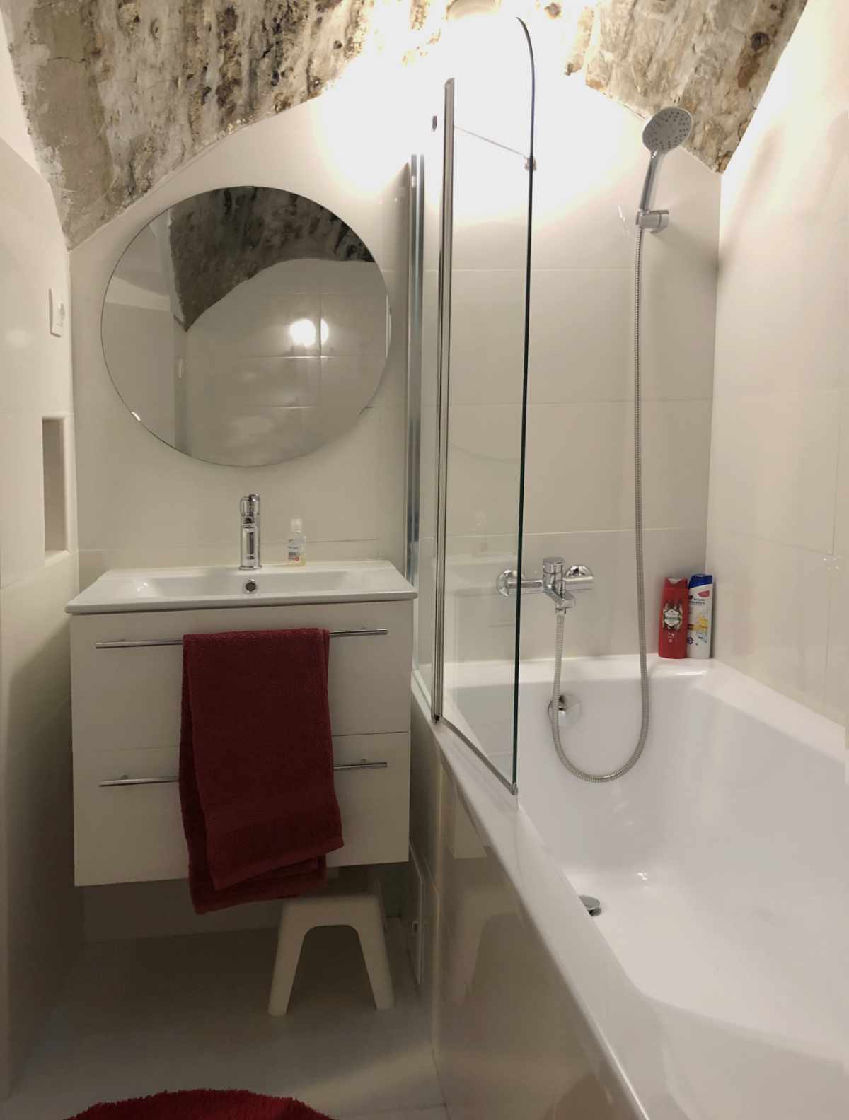 Idén újítottuk fel a fürdőszobát, szerintünk nagyon hangulatos lett. Meghagytuk az íves mennyezeten a rusztikus tégla burkolatot. Kár lett volna lefesteni, vagy eltakarni…